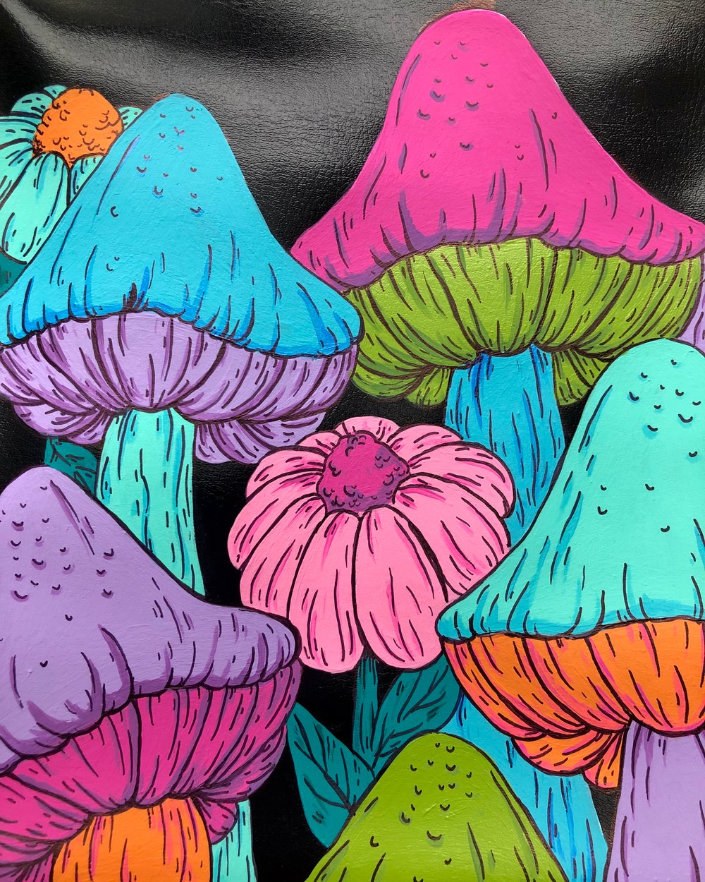 The Penelope bag is a brand new hand-painted mini-backpack made out of black vegan leather. There are adjustable shoulder backpack straps, a handle on top, and a detachable shoulder strap for over-the-shoulder carrying.