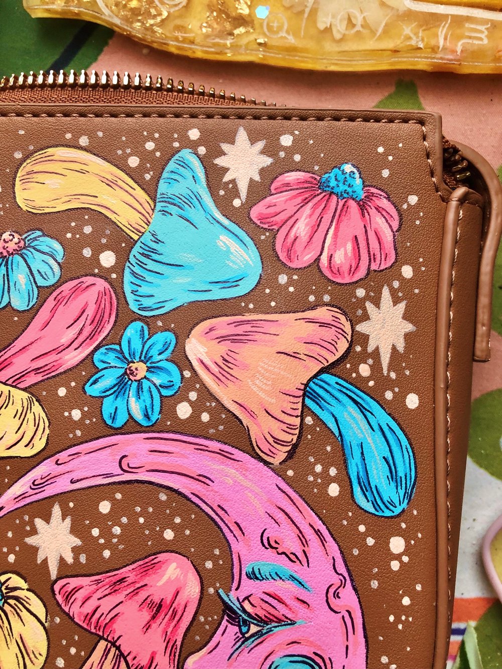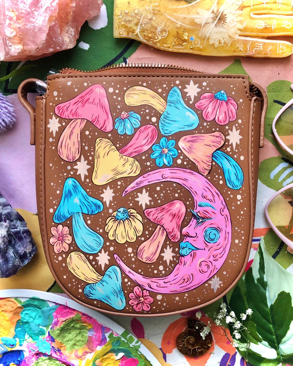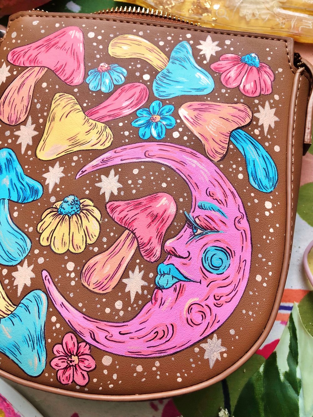 The Riley purse is a brand new, hand painted purse made out of cognac vegan leather. It is saddle-bag style with an adjustable cross-body strap. The design features colorful mushrooms, flowers, a moon, and stars.