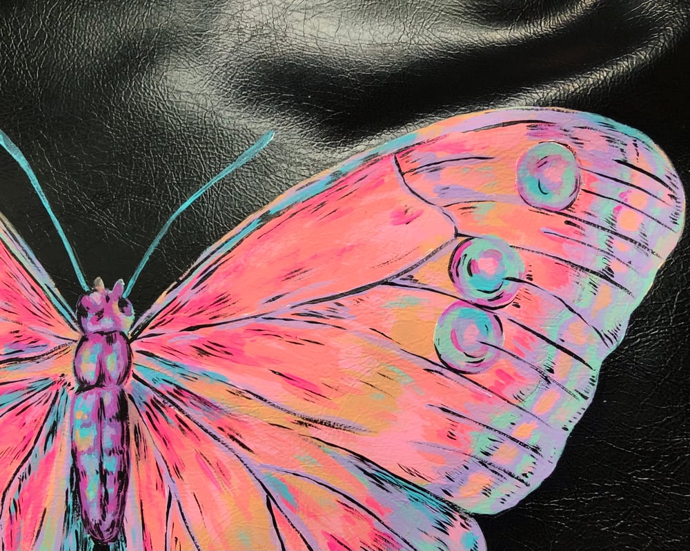 The Valeria purse is a brand new, hand-painted purse made from black vegan leather. The strap is adjustable strap, meaning it can be worn cross-body or over the shoulder. The design features a colorful butterfly.